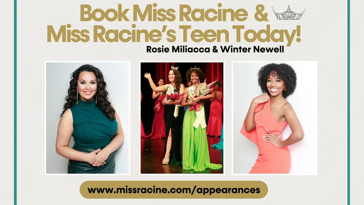 Book Miss Racine 2026, Rosie Miliacca and Miss Racine's Teen 2026, Winter Newell for your event today! Our titleholders are available for speaking engagements regarding their Community Service Initiatives, school visits, parades, autograph signing, mingling with guests and so much more! To book Miss Racine & Miss Racine's Teen by clicking the link below.